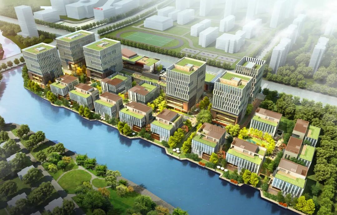 长达千米的苏州河双洋港成为华泰中心的黄金水道,让企业独栋有凭栏临河的胜景,园区内的高层标准办公也同样享受滨河景观。